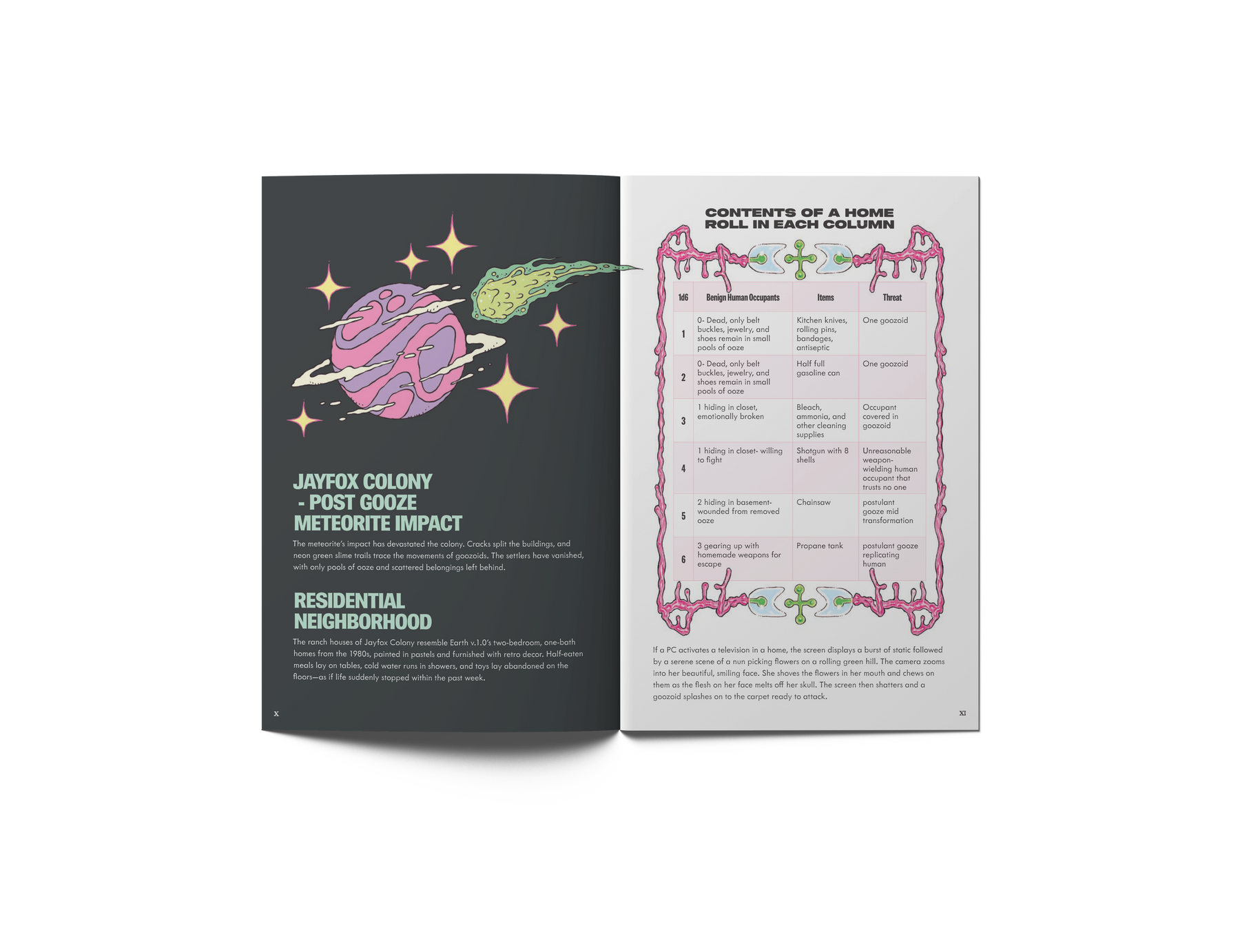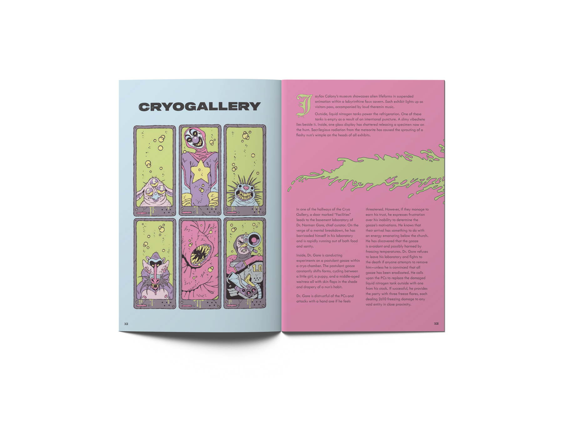 Ooze Nun is steeped in sacrilege, seduction and slimy body horror. Players are sent to investigate a strange meteor crash on the small Jayfox Colony.