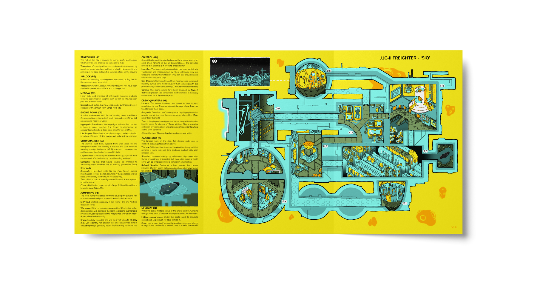 Map: A detailed isometric map of the spaceship Siq and a printer-friendly, spoiler-free 2D digital map designed to be handed out to players.