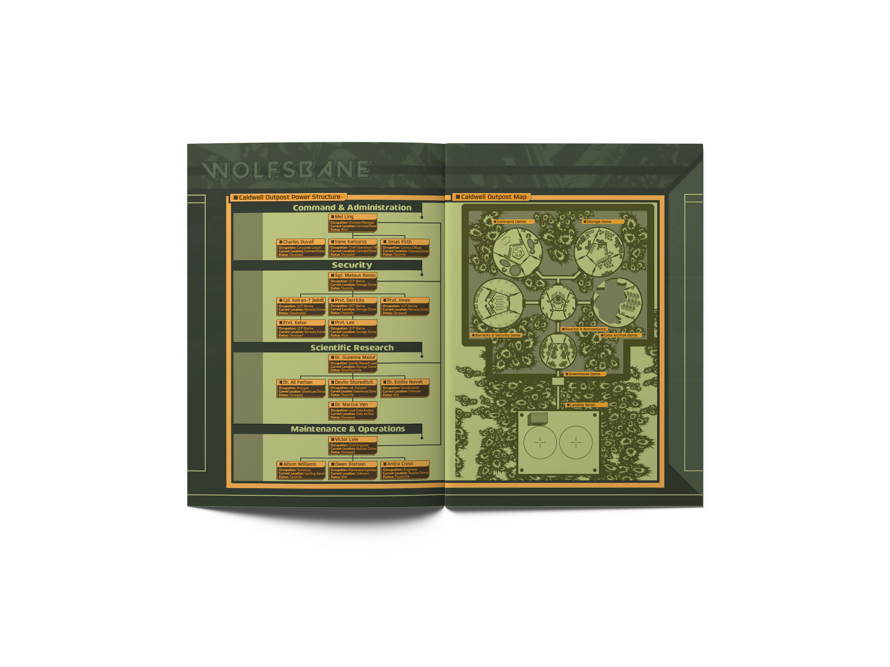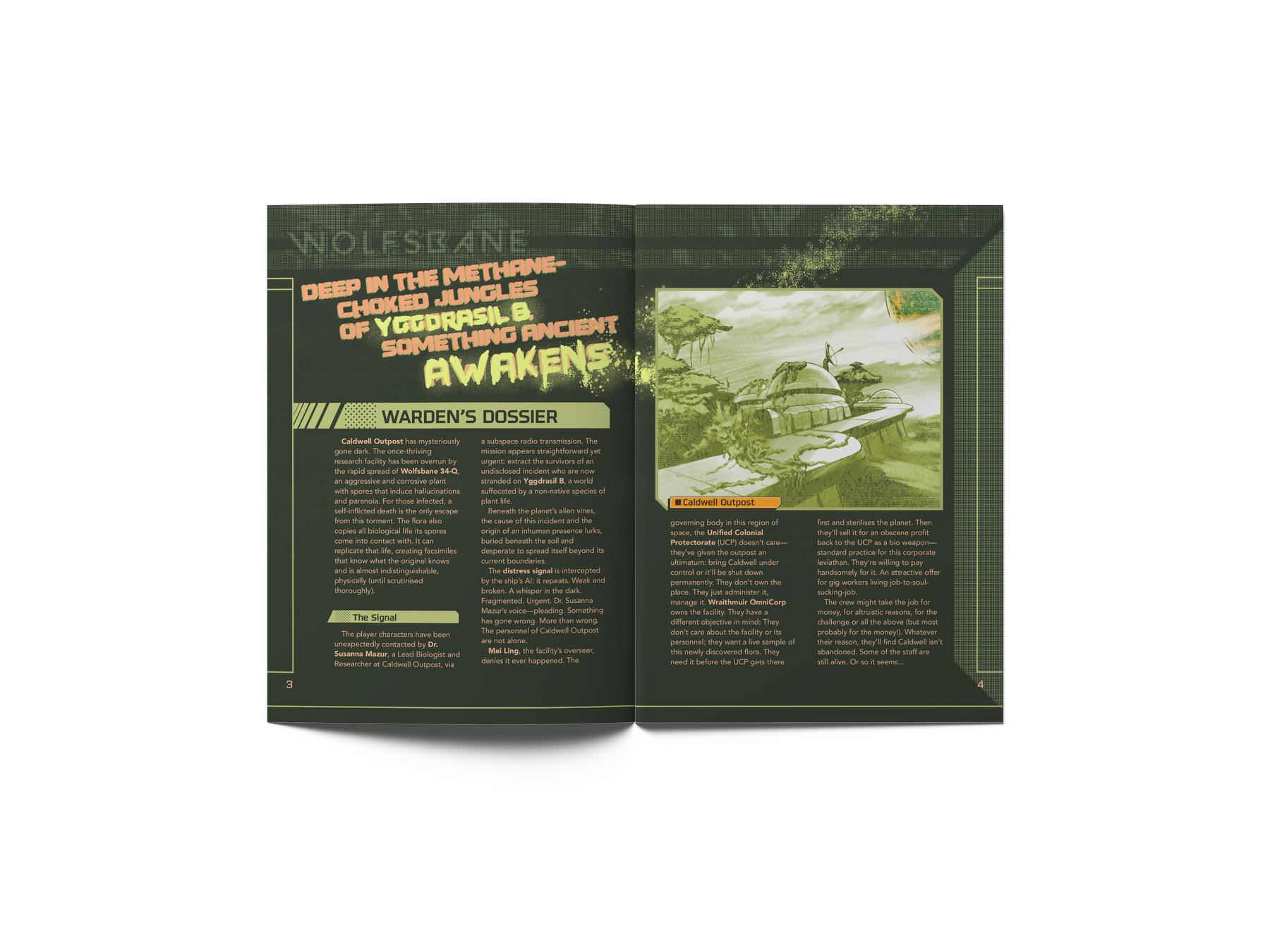 In Wolfsbane, the PC's receive a distress signal originating from Caldwell Outpost, a remote biological research station buried deep in the dense jungle canopy of Yggdrasil B. The outpost has gone silent, save for this one terror-inducing transmission. Inside the research station's domes, something has taken root—a species of xenobiological flora not native to this world; the researchers call it 'Wolfsbane 34-Q'. It spreads through spores, mimics the infected, and turns fear into a weapon, leading ultimately in a maddening death. As trust fractures and hallucinations set in, players must decide who to believe—and whether anyone can be saved.